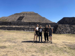 Jill, Rafa, me and Jessie posed for our picture with one temple in the background that was 800 meters away. This gives you an idea of the magnitude of the pyramid and the structures enveloping them. The number of stones used to build a wall, much less a temple, are unimaginable. Even more is transporting the stones from the surrounding areas to the pyramid site is even more unimaginable. Certainly, there were few too many stones in the immediate area to build such a magnificent infrastructure. At the site there was housing facilities and cultural center that purportedly was a gathering center for the ancient civilizations. More impressive than this site was Machu Picchu in Peru, where I had similar considerations and couldn’t help but wonder how these civilizations may have once been related to one another and possibly conducted trade across continents.